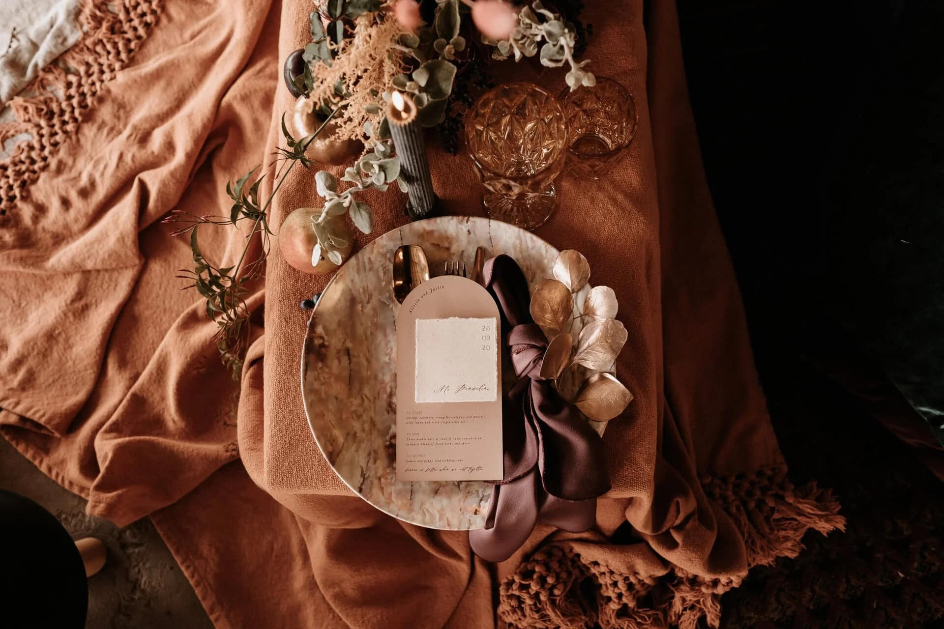 luxe boho wedding elopement inspiration microwedding elope bohemian roses terracotta olive fruit floral peach candles luxury london wedding photographer